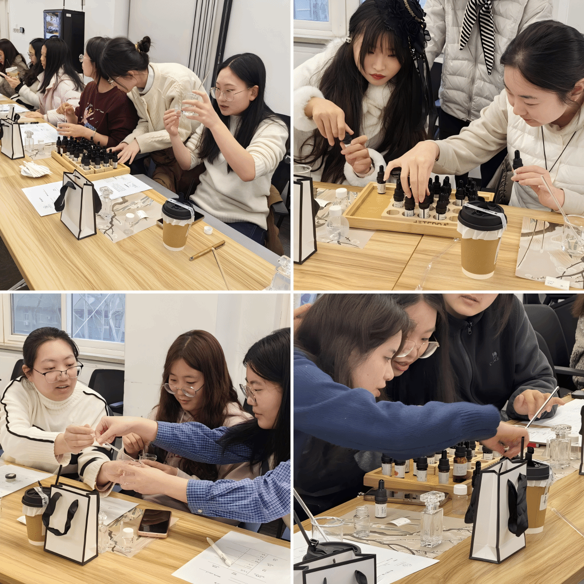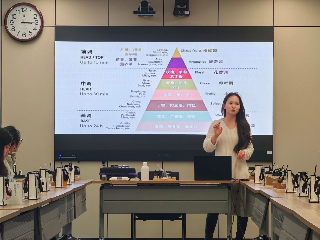 活动特邀专业教师现场授课,从香水专业知识入手,为同学们带来了一堂生动有趣的调香课。老师围绕香水类型、十二大香调分类展开详细讲解,重点阐释了香水前调、中调、后调的层次特点与搭配逻辑,结合玫瑰、茉莉、雪松、柑橘等常见香调类型的香气特质,分享了香调搭配的基本原则与小技巧。