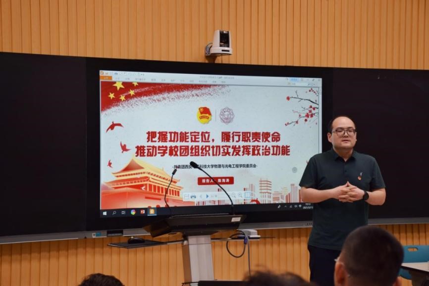 (通讯员:王超 席奥博)5月14日晚七时,在公司南校区C栋教学楼104室,物理与光电工程公司团委书记陈海涛以“把握功能定位,履行职责使命,推动公司团组织切实发挥政治功能”为主题,为公司团学组织全体员工干部讲团课。本次团课以线上线下相结合的形式进行,此前已下发相关学习资料,未到场员工干部通过腾讯会议在线上平台观看。本次团课由团委副书记刘泽霖主持,副书记席奥博做记录。