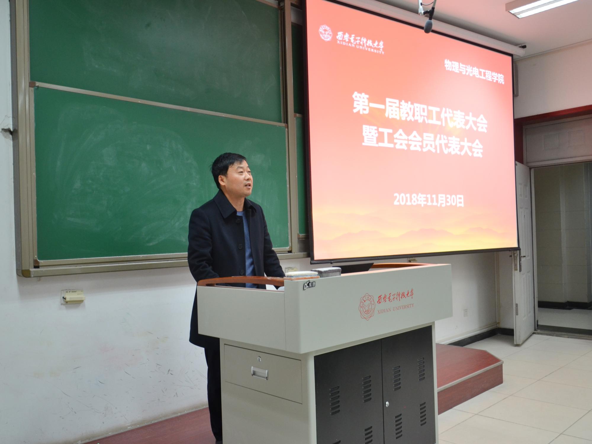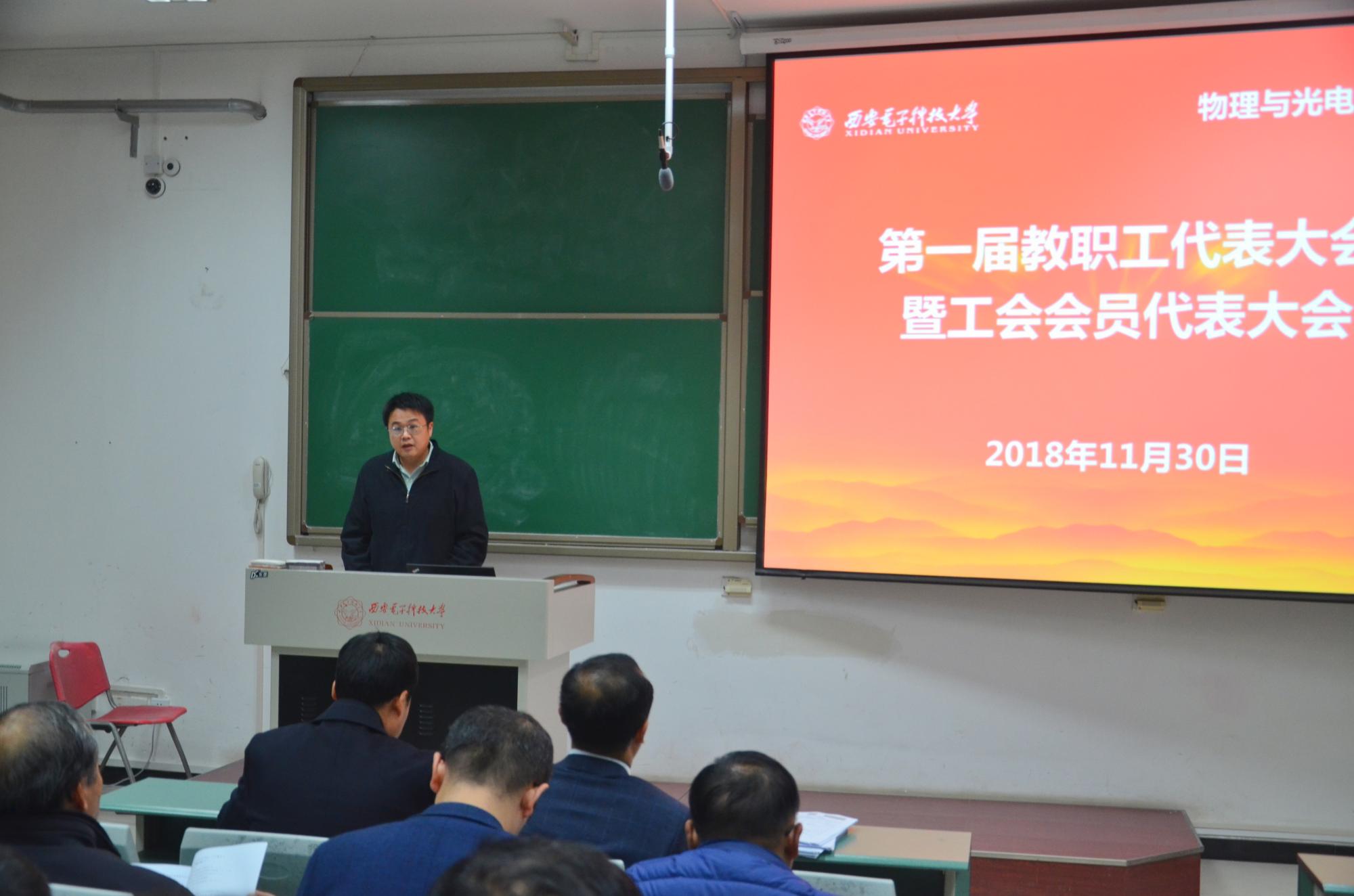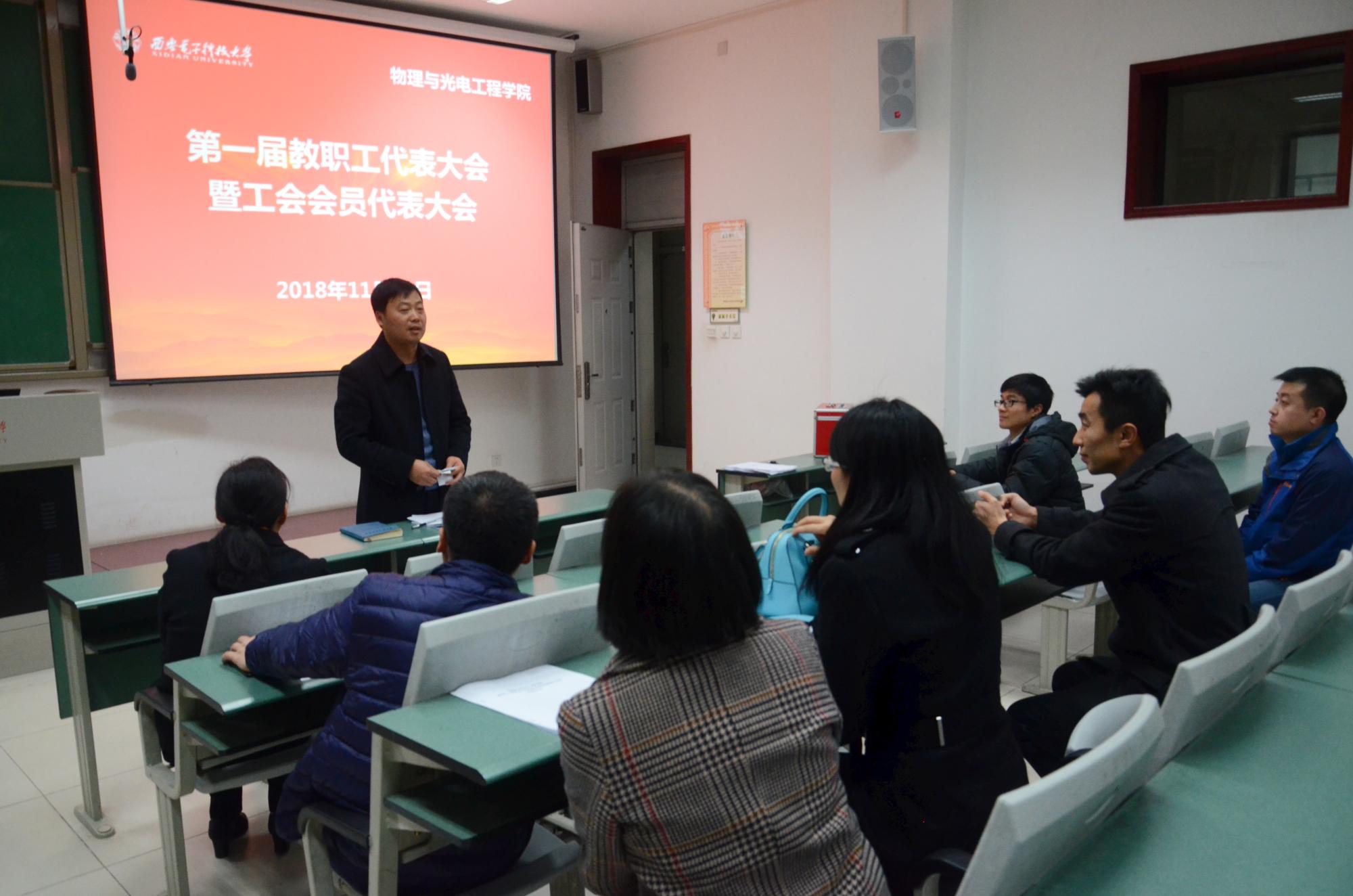 (通讯员:姚娇)11月30日晚,在雄壮嘹亮的国歌声中,物理与光电工程公司第一届教职工代表大会暨工会会员代表大会在西大楼106教室召开,会议表决通过了公司2018-2020年专业技术岗位聘任实施方案,投票选举产生了公司新一届工会委员。公司领导班子等53位教代会代表参加了会议。大会由公司党委书记独国社主持。