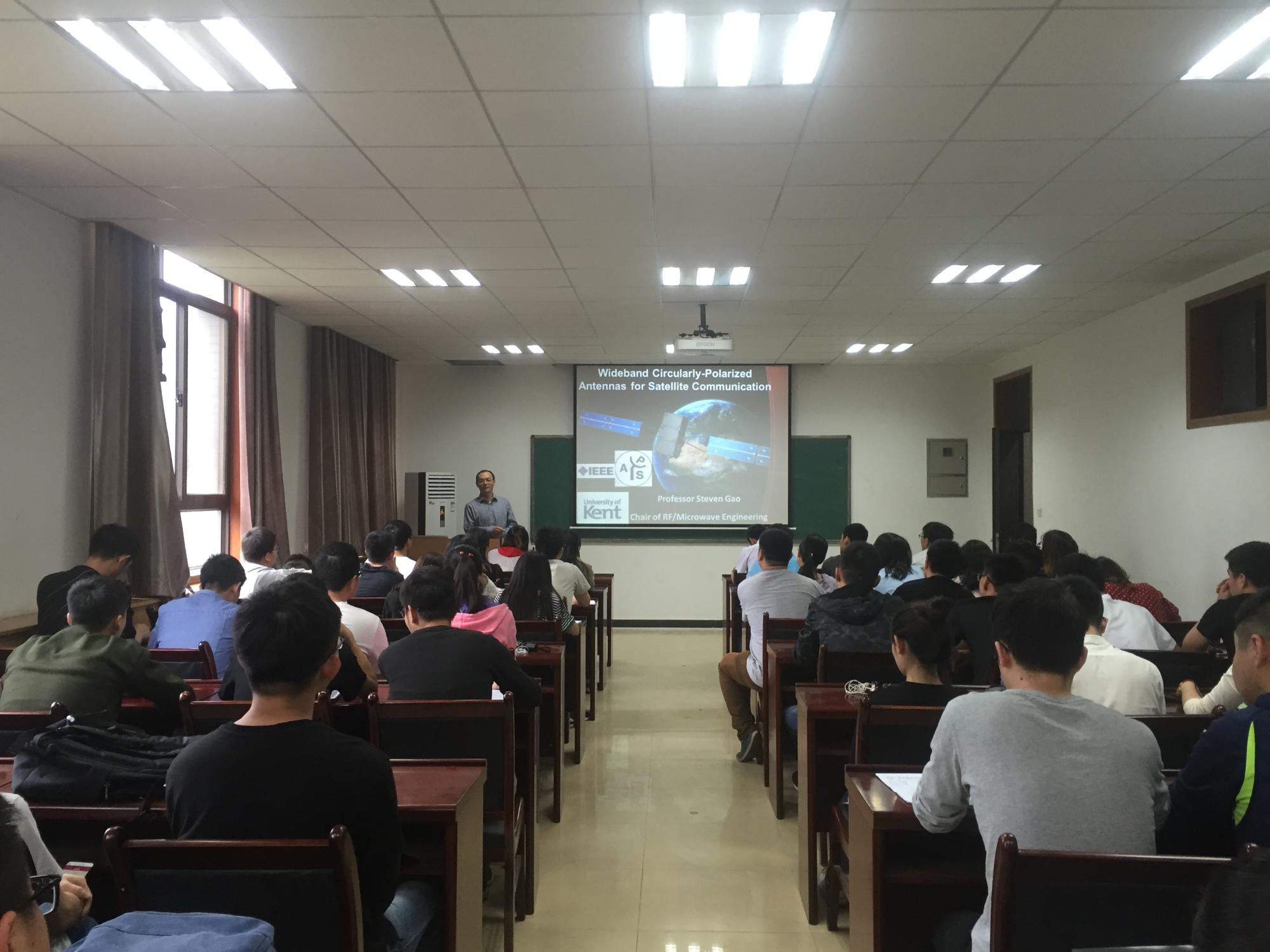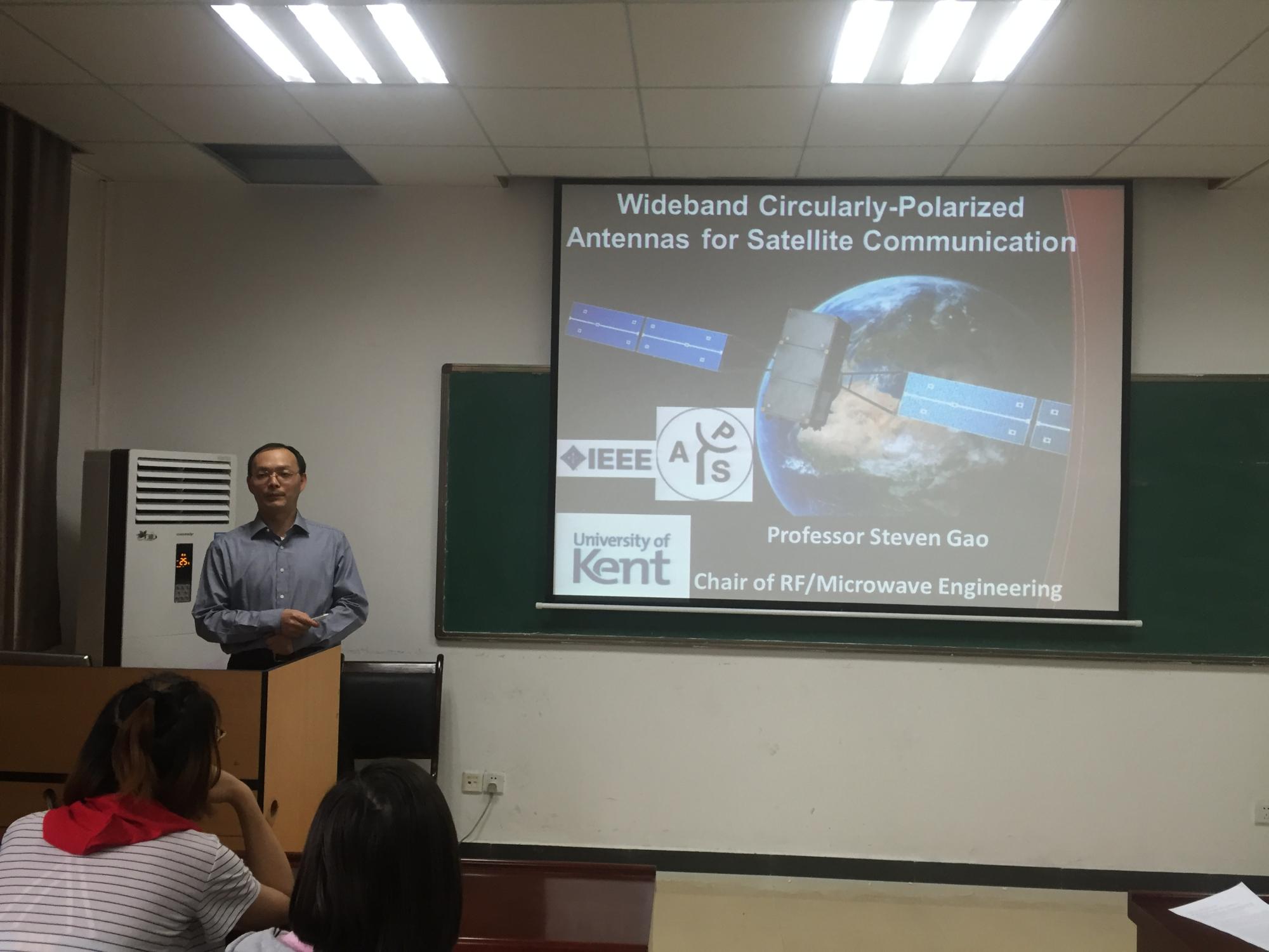 5月4日下午,高式昌教授于西大楼Ⅲ-405报告厅做了题为“Wideband Circularly Polarized Antennas and Arrays for Satellite Communications”的学术报告,报告会由公司副经理周慧鑫教授主持。报告中,他以天线在日常生活中的应用作为切入点,引出了学术报告的主题——卫星通讯中的宽带圆极化天线和阵列。他详细地讲述了近年来宽带圆极化天线元件和阵列卫星通讯的发展和基本原理,并通过全球导航卫星系统(GNSS)、无线局域网和无线电力传输系统等16个具体应用实例展示了目前该领域的研究进展。随后,他图文并茂地展示了自己所在团队在圆极化天线领域所做的相关工作,重点讲解了使用倒S元素的宽带圆极化天线元件和单层宽带圆极化天线高效率反射器的具体研究情况、目前取得的研究成果和今后的应用前景。