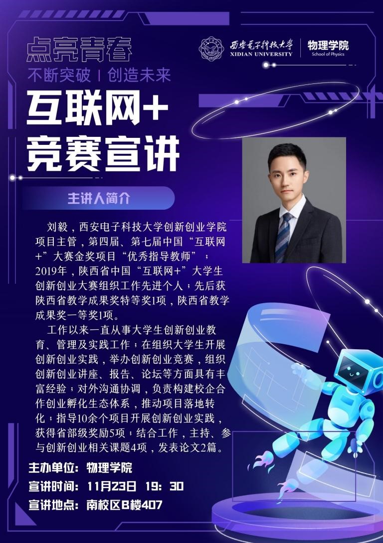 (通讯员:邵思颖 景玉)为持续加强基础学科和拔尖创新人才培养,11月24日304永利集团有限公司成功举办了“互联网+”大赛宣讲活动,本次活动面向304永利集团有限公司全体员工,以线上线下相结合的方式同时进行, 线上以“腾讯会议”的方式于 19:30正式开始,线下在南校区B406室同步进行。本次活动由公司创新创业公司项目主管刘毅老师主讲,由辅导员景玉老师主持。刘毅老师曾获得第四届、第七届中国”互联网+”大赛金奖项目“优秀指导教师”。