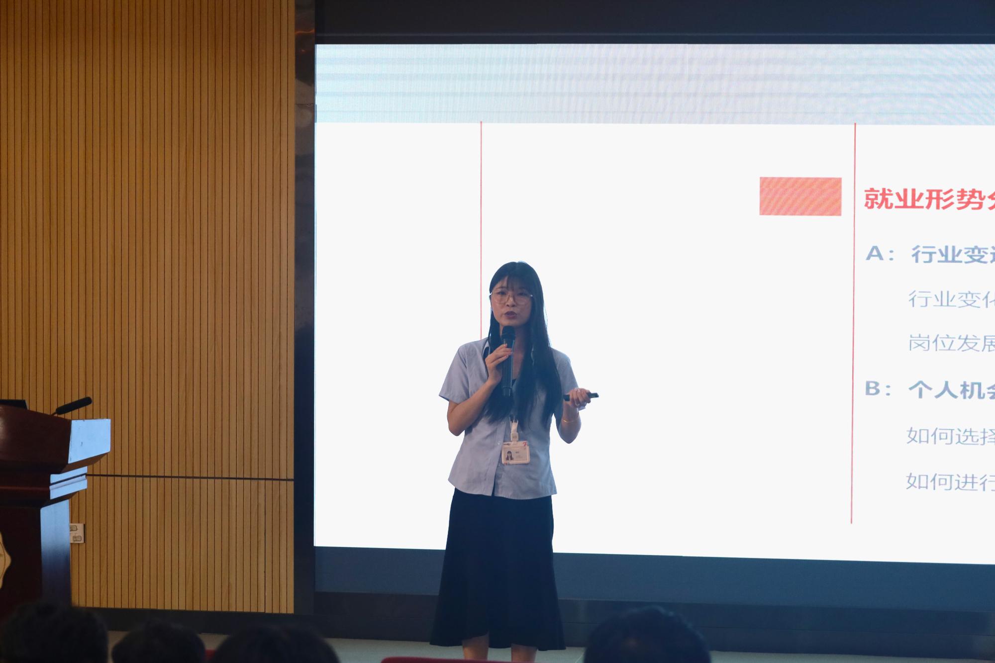 活动初始,比亚迪集团讲师郭珂就近年来的就业形势进行了分析,从同学们认为的“热门行业”入手,打破了大家对于部分行业的“刻板印象”。近年来各个行业的发展与变迁都与国家的发展及政策导向密不可分,而职业的选择也关乎到个人未来的发展前景,因此行业选择、职业选择在同学们的职业生涯中尤为重要。接着郭珂老师向同学们介绍了自我分析方法,从擅长、需求、兴趣、性格等的方面让同学们了解自身的基本情况和与岗位的匹配情况,并结合自身的工作经验向大家分享了择业的重要性。