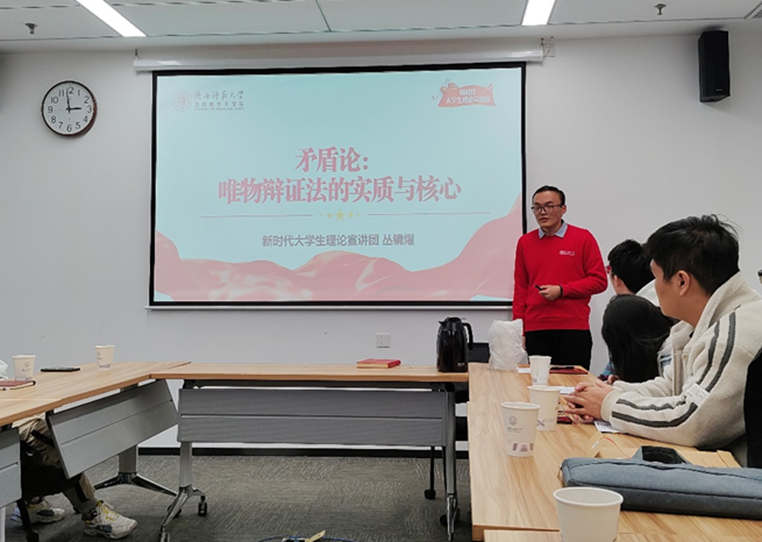 陕西师范大学宣讲团李智祥、丛镜燿首先从《实践论》、《矛盾论》开讲,鼓励大家在学习工作中坚持马克思主义的基本原理、坚持实事求是,发扬马克思主义的鲜明品格。