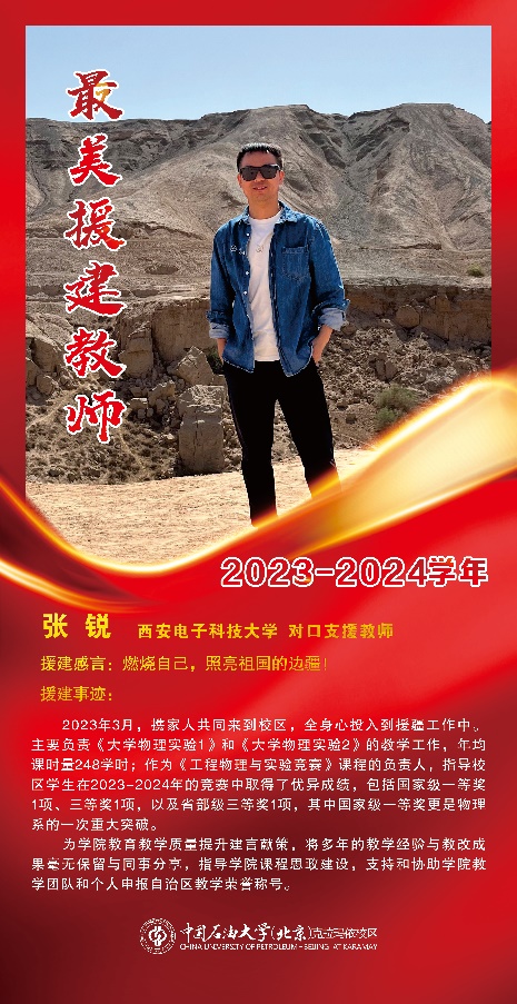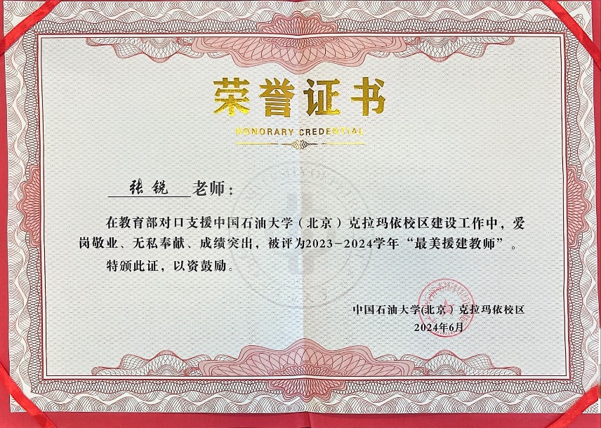2022年8月,304永利集团有限公司教师张锐响应教育部关于支援西部建设、助力教育强国政策,前往中国石油大学(北京)克拉玛依校区物理系进行对口援建工作。2024年6月获得克拉玛依校区首届“执教天山下”援建文化节2023-2024学年“最美援建教师”称号,并作为“最美援建教师”代表接受克拉玛依市融媒体中心的采访。