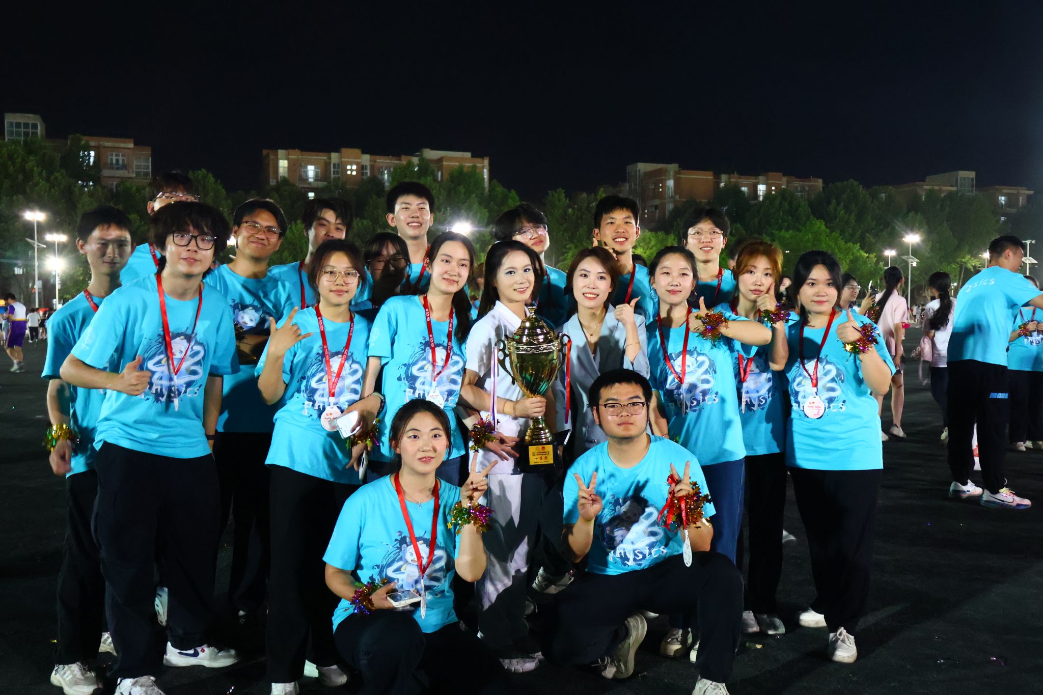 舞蹈队形的编排设计更是别出心裁。通过队员们队形变换最终拼成字母“PHY”(英文PHYSICS的缩写),完美呈现出304永利集团有限公司的特色。同时,304永利集团有限公司吉祥物“菲菲”也参与到此次舞蹈竞演中,与场下观众积极互动并发放精美礼品,可爱的外表与有趣的学科特色元素设计吸引着现场师生的热烈关注。