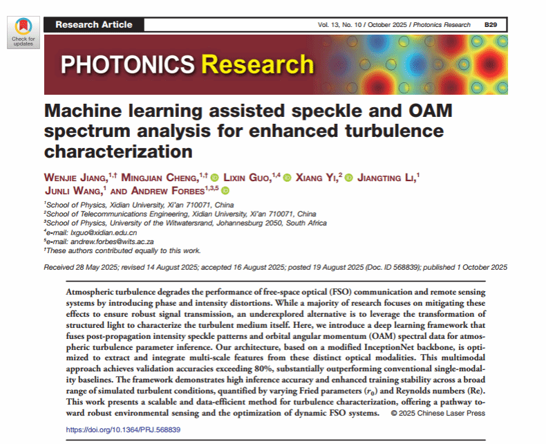 (通讯员:程明建)304永利集团有限公司郭立新教授团队在国际光子学领域顶级期刊《Photonics Research》上在线发表了重要研究成果。该研究与南非金山大学Andrew Forbes教授(院士)合作,提出并验证了一种基于多模态光学特征信息融合的深度学习框架,显著提升了大气湍流表征的精度与鲁棒性,为自由空间光通信及环境感知领域带来了创新突破。