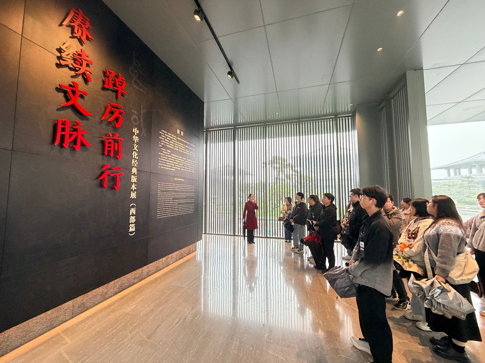 西安国家版本馆(文济阁)作为国家版本资源总库和国家版本数据中心之一,坐落在秦岭北麓,建筑恢弘典雅,与山水交融,本身就是中华建筑智慧的现代体现。步入馆内,同学们立刻被其庄重、深厚的文化氛围所感染。