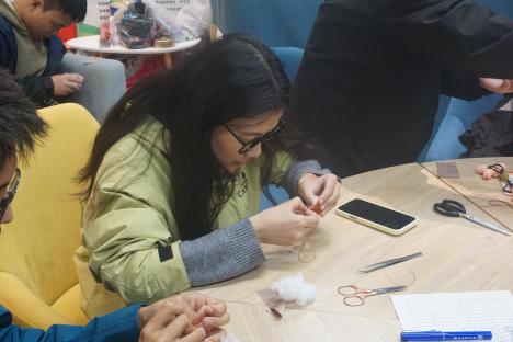 活动结束后,2024级本科生龚子涵分享了自己的参与感受:“暖阳驱散阴雨,我走进航天路社区服务站参与针织志愿活动。初时穿针引线屡屡受挫,急得放下针线。社区老师开导我:‘针织要耐心,是快节奏生活的必修课。’我沉下心专注缝制,终在慢节奏中体会到专注的力量,也收获了别样的成长。”